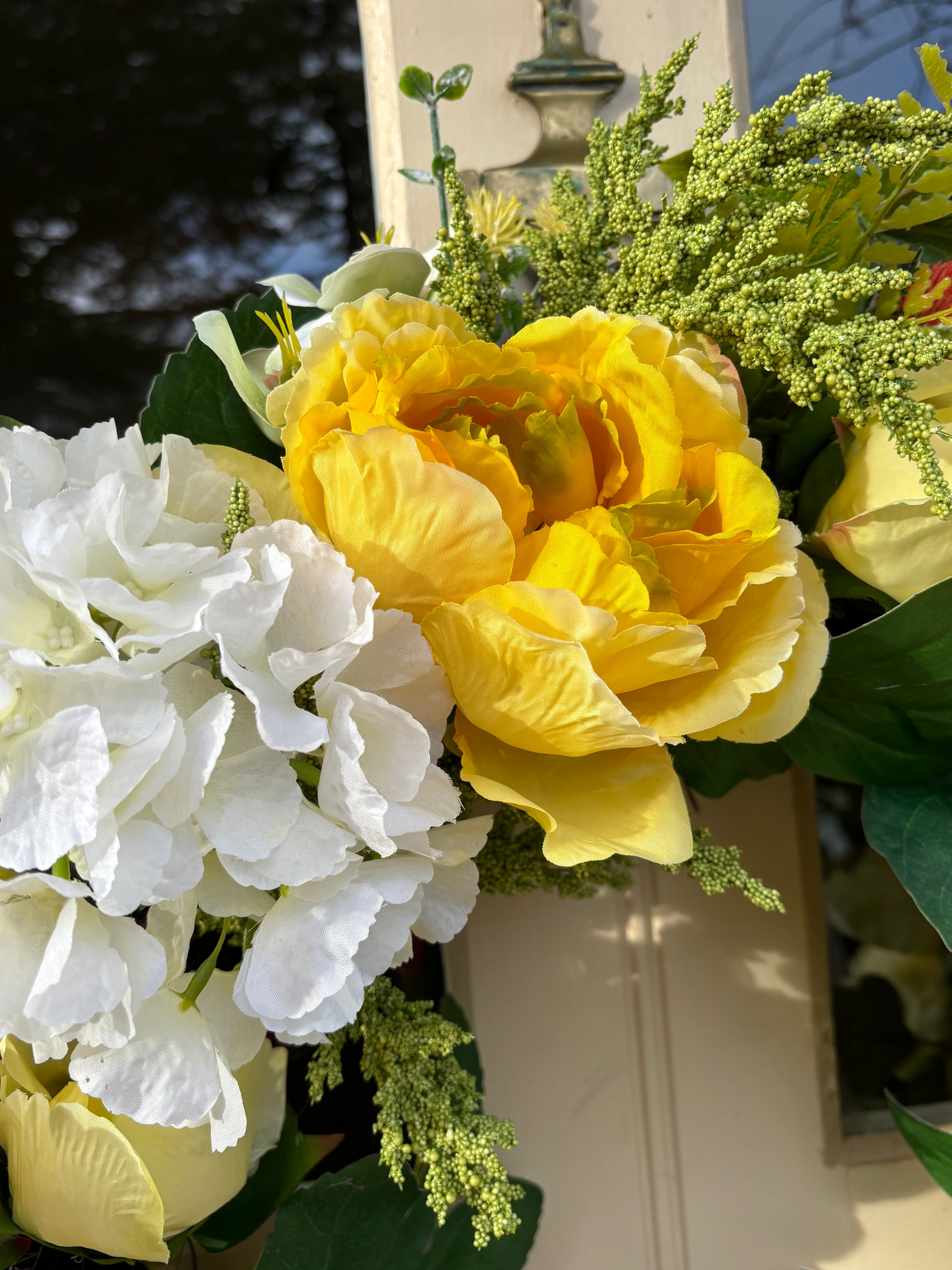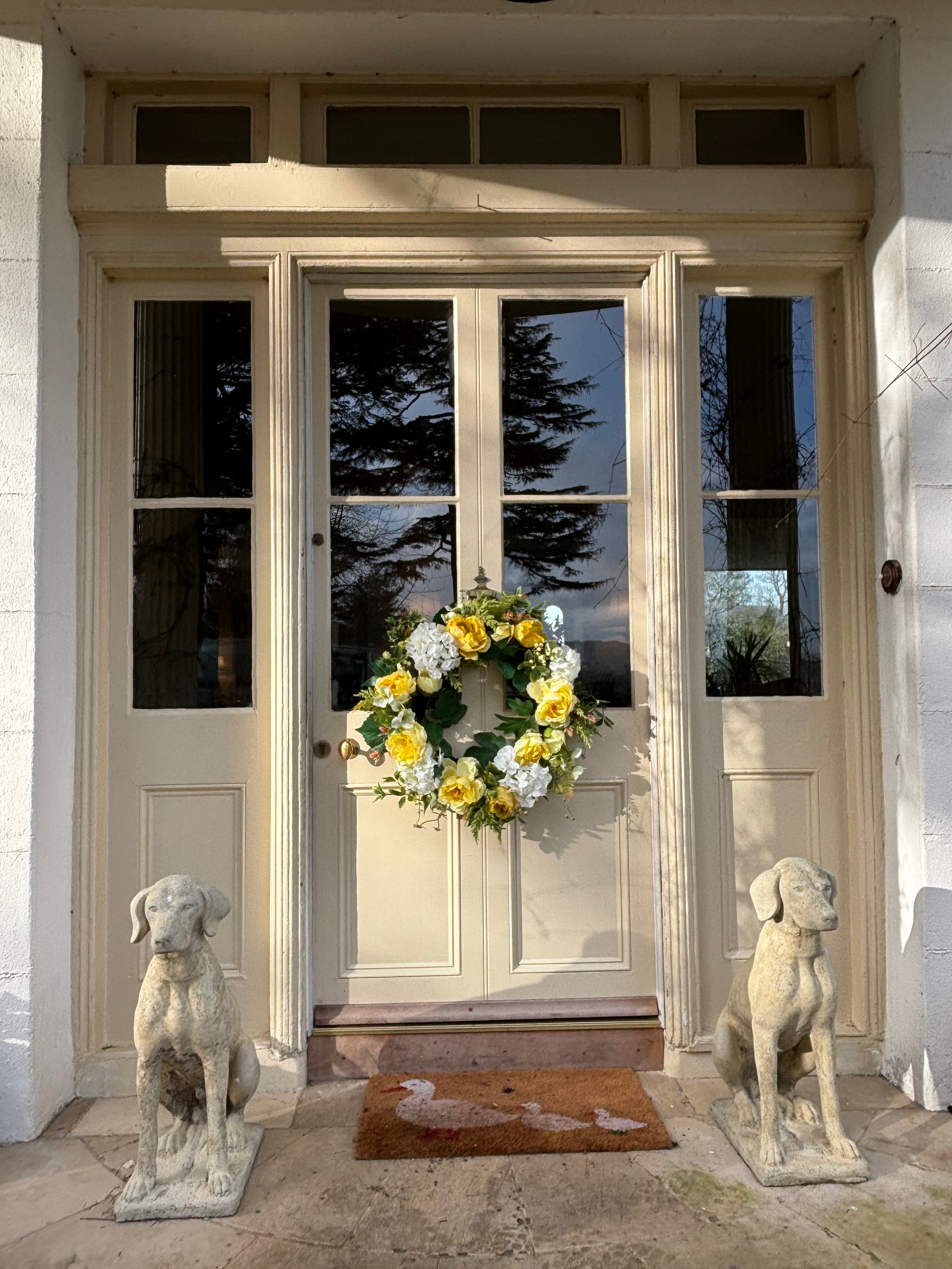 Brighten your space with the timeless elegance of our Rose and Hydrangea Wreath. The combination of classic white and sunny yellow, creates a warm and inviting statement.