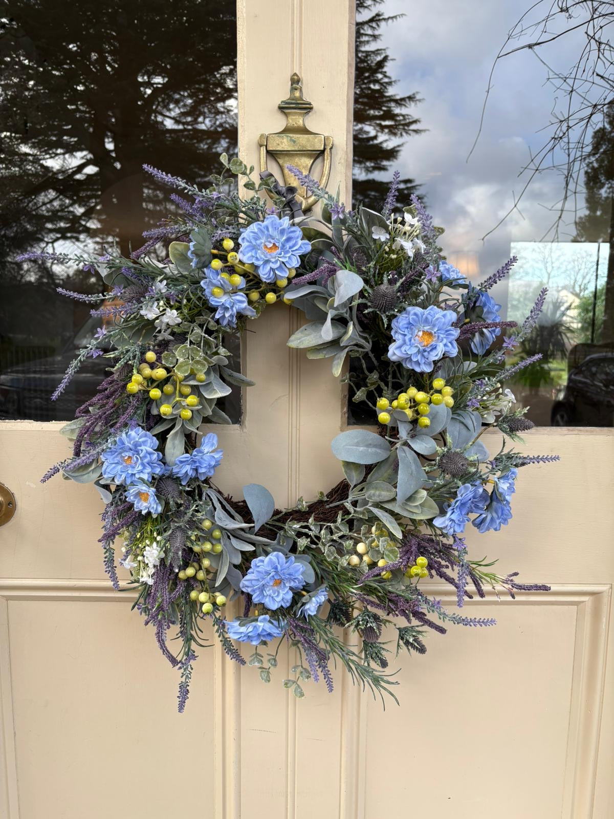 Create a calming, elegant welcome with this Blue Spring Meadow Wreath. Designed with soft blue blooms, delicate lavender sprigs, eucalyptus leaves, and subtle berry accents. It brings a serene, garden inspired touch this season.